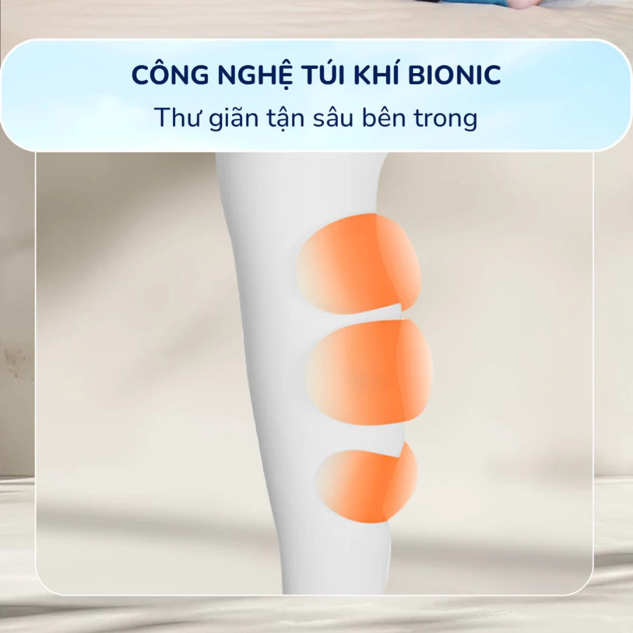 Điểm nổi bật của máy massage bắp chân BUMAS M5 nằm ở công nghệ túi khí Bionic tiên tiến, sử dụng các túi khí co giãn linh hoạt để mô phỏng thao tác bóp, ấn, và xoa nhẹ như bàn tay người thật. Khi túi khí nén và xả nhịp nhàng, lực tác động lan tỏa đều khắp vùng cơ bắp chân, giúp làm mềm cơ, giảm đau nhức và hỗ trợ lưu thông máu tốt hơn. Nhờ đó, người dùng cảm nhận rõ rệt sự nhẹ nhõm và thư giãn chỉ sau vài phút sử dụng.
