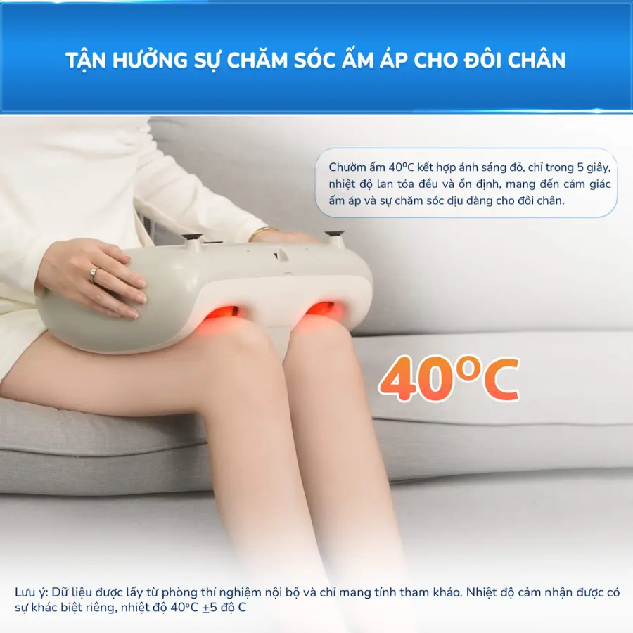 BUMAS M15 được trang bị chức năng chườm nóng thông minh với mức nhiệt ổn định khoảng 40 độ C. Nhiệt lượng lan tỏa đều chỉ sau vài giây, kết hợp cùng ánh sáng đỏ hồng ngoại giúp giãn cơ nhanh, tăng lưu thông máu và hỗ trợ giảm sưng đau. Công nghệ này đặc biệt hữu ích vào mùa lạnh, khi cơ thể dễ bị co cứng hoặc tê bì chân tay do khí huyết lưu thông kém.
