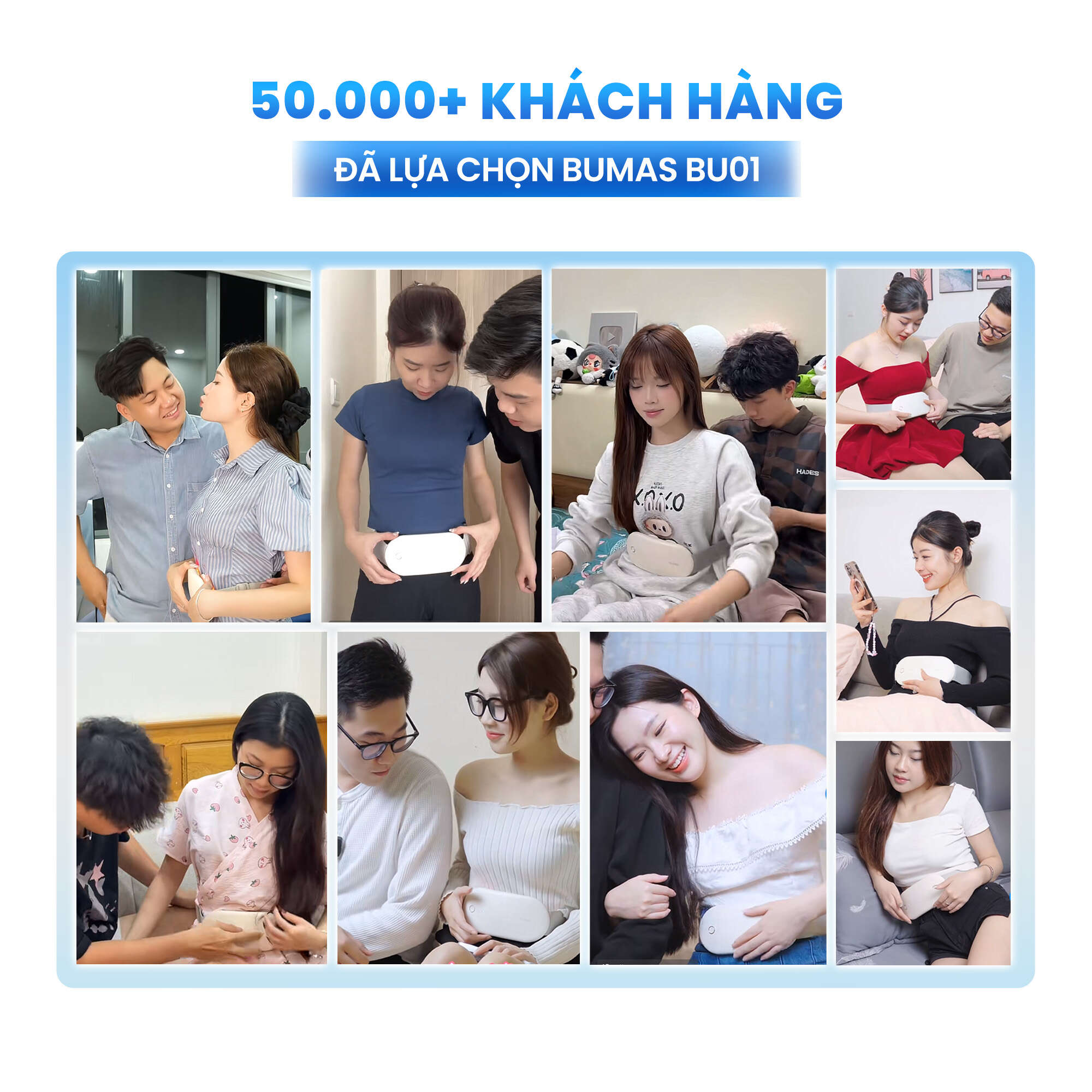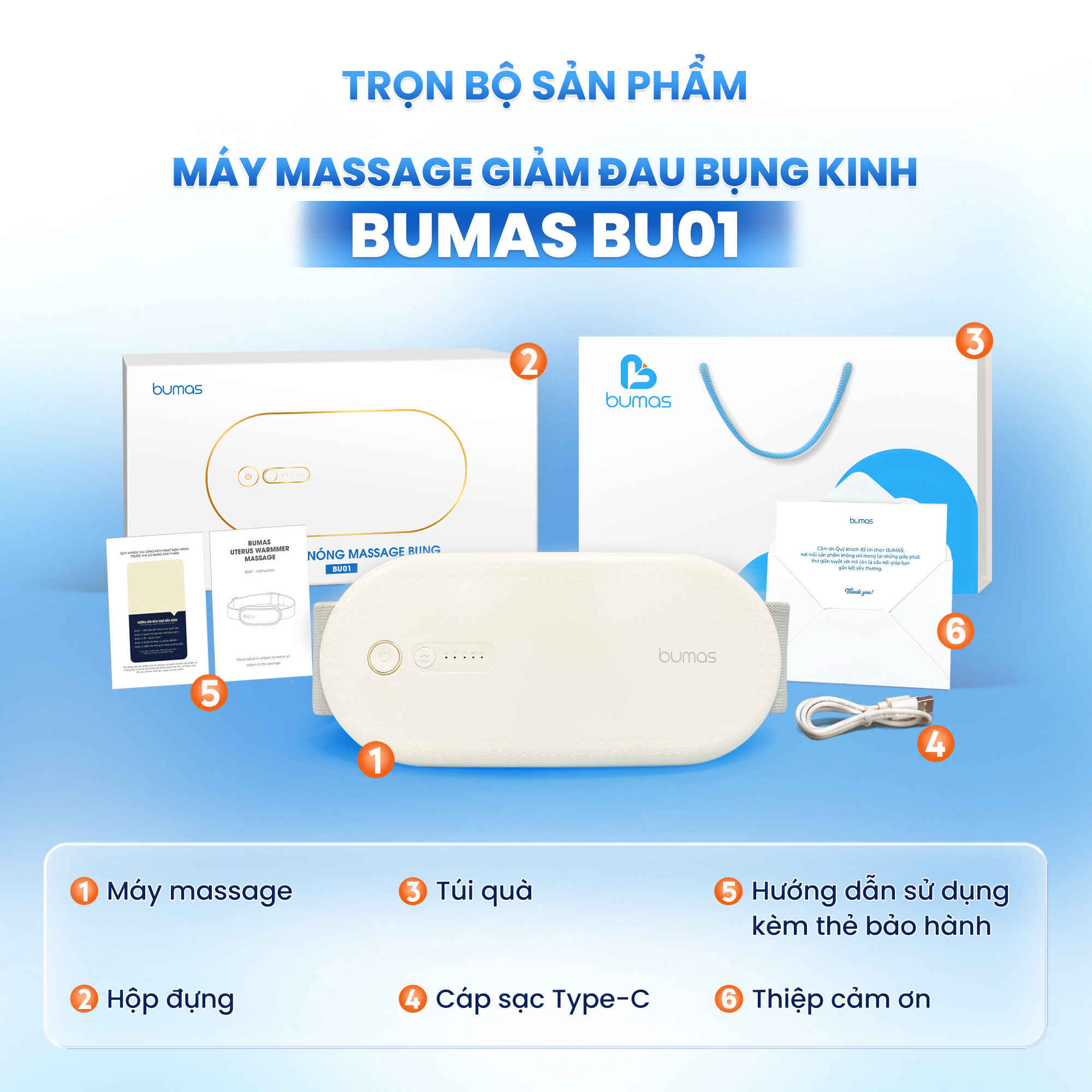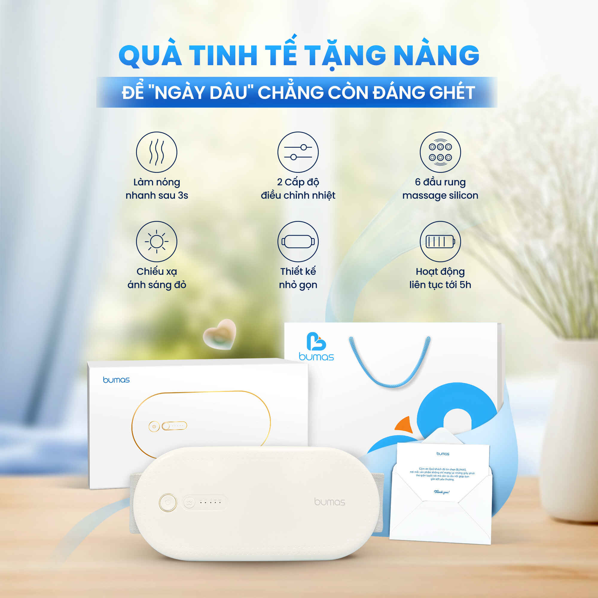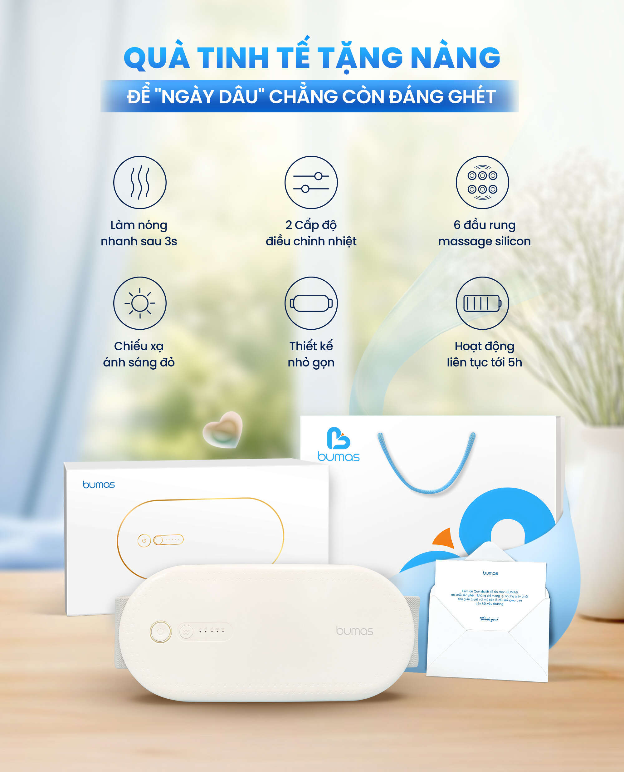 Đai massage bụng BU01 của BUMAS không chỉ làm ấm bụng còn các khả năng tác động sâu tử cung giúp đẩy nhanh giảm đau bụng kinh hơn, công nghệ kiểm soát nhiệt an toàn tuyệt đối với nhiều chế độ hơn cùng 6 điểm rung massage tạo cảm giác dễ chịu)