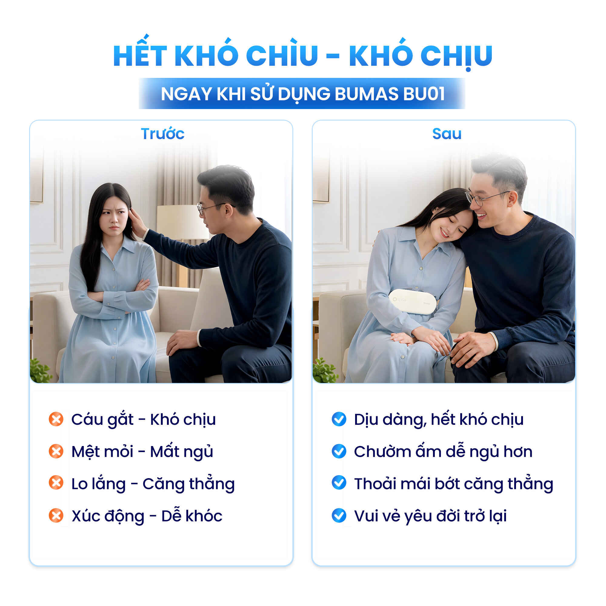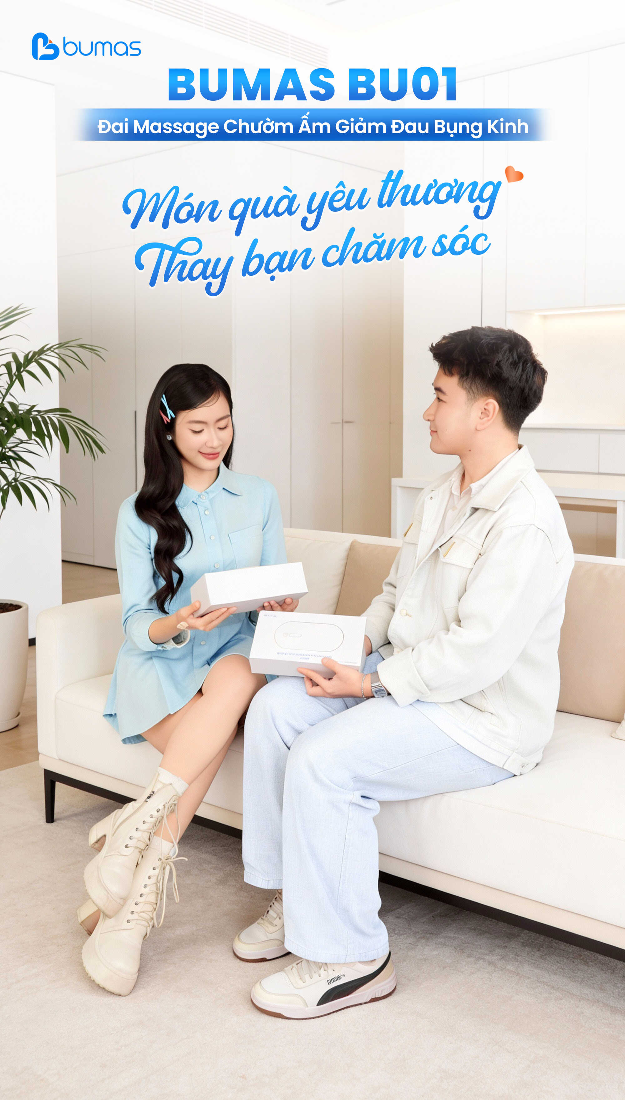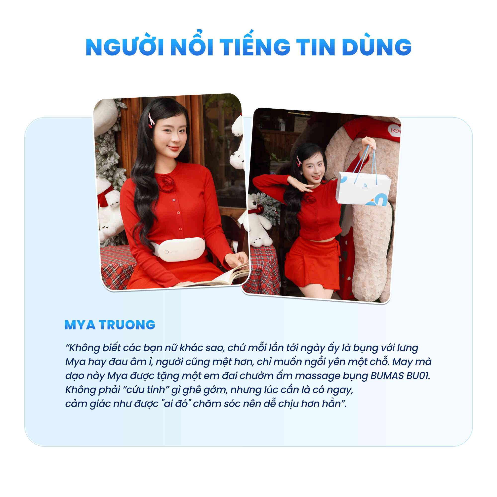 Đai massage bụng BU01 của BUMAS không chỉ làm ấm bụng còn các khả năng tác động sâu tử cung giúp đẩy nhanh giảm đau bụng kinh hơn, công nghệ kiểm soát nhiệt an toàn tuyệt đối với nhiều chế độ hơn cùng 6 điểm rung massage tạo cảm giác dễ chịu)