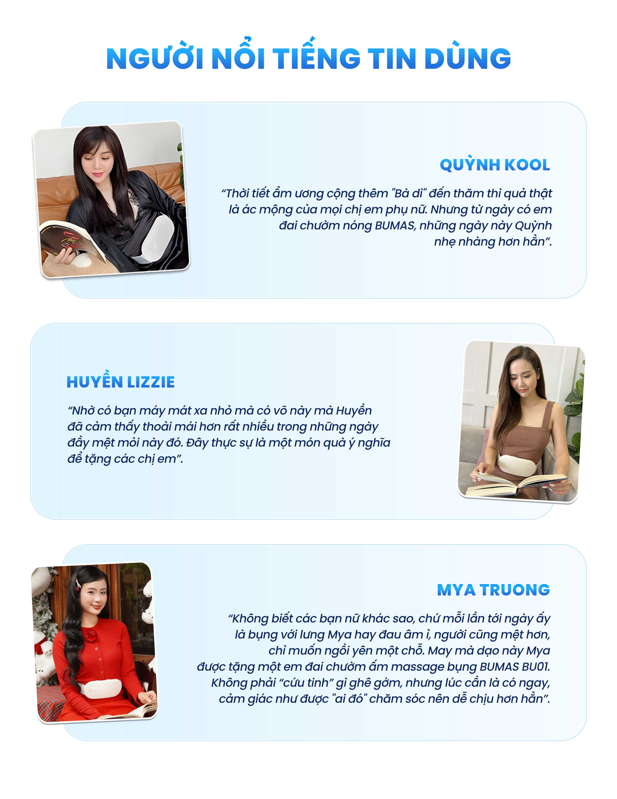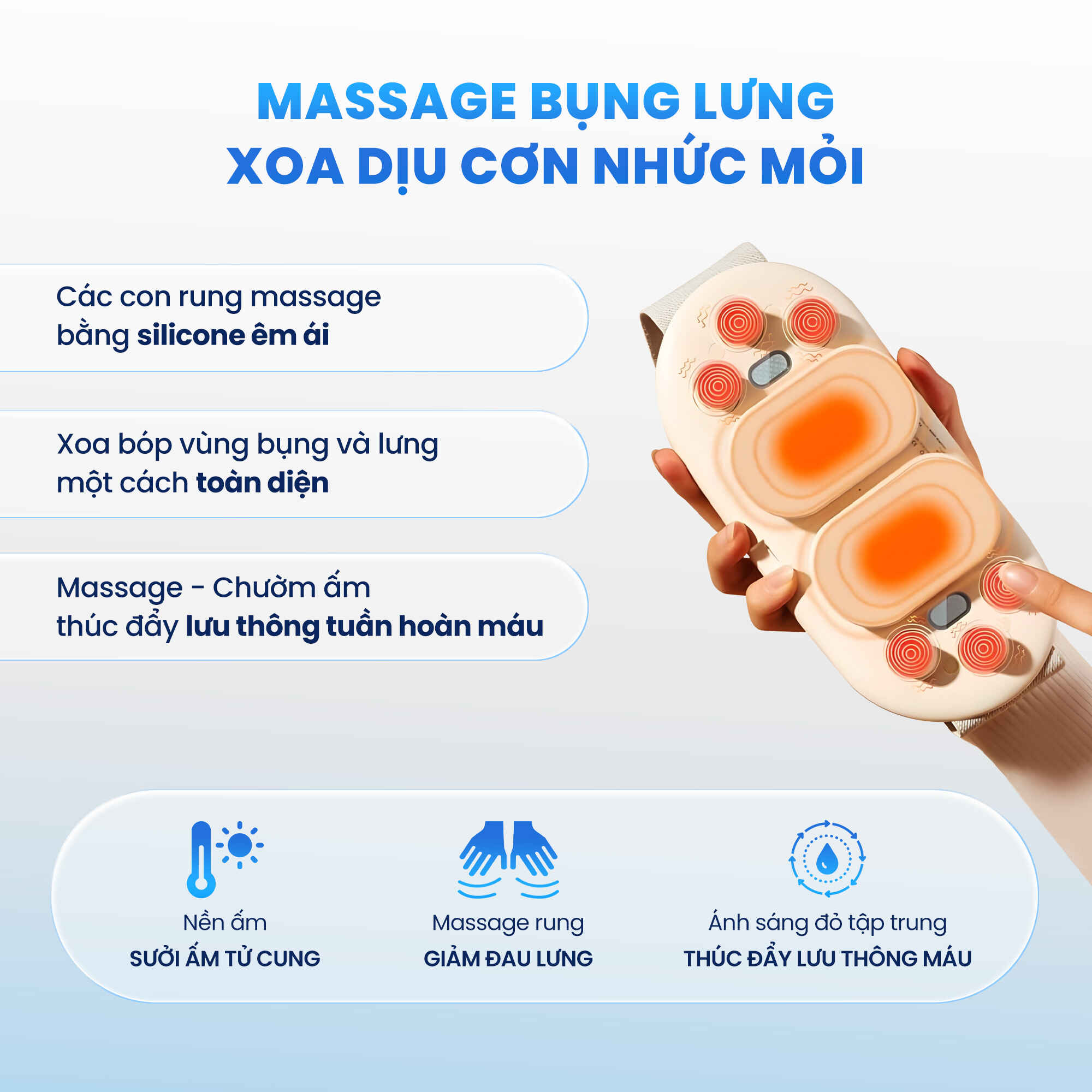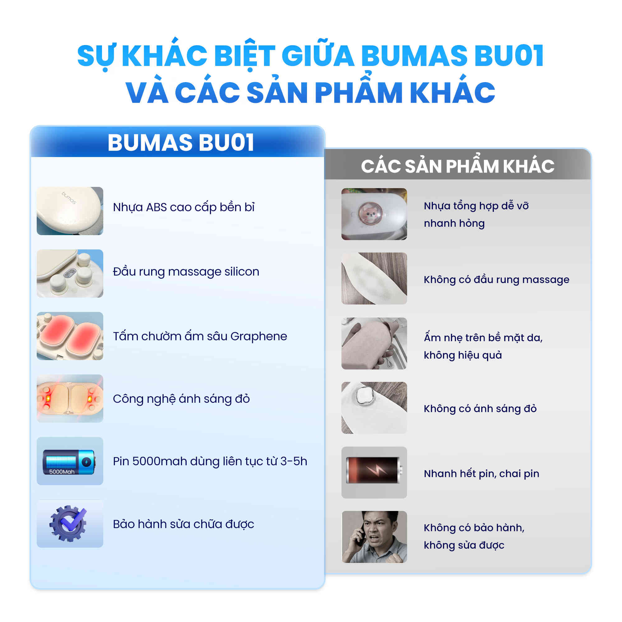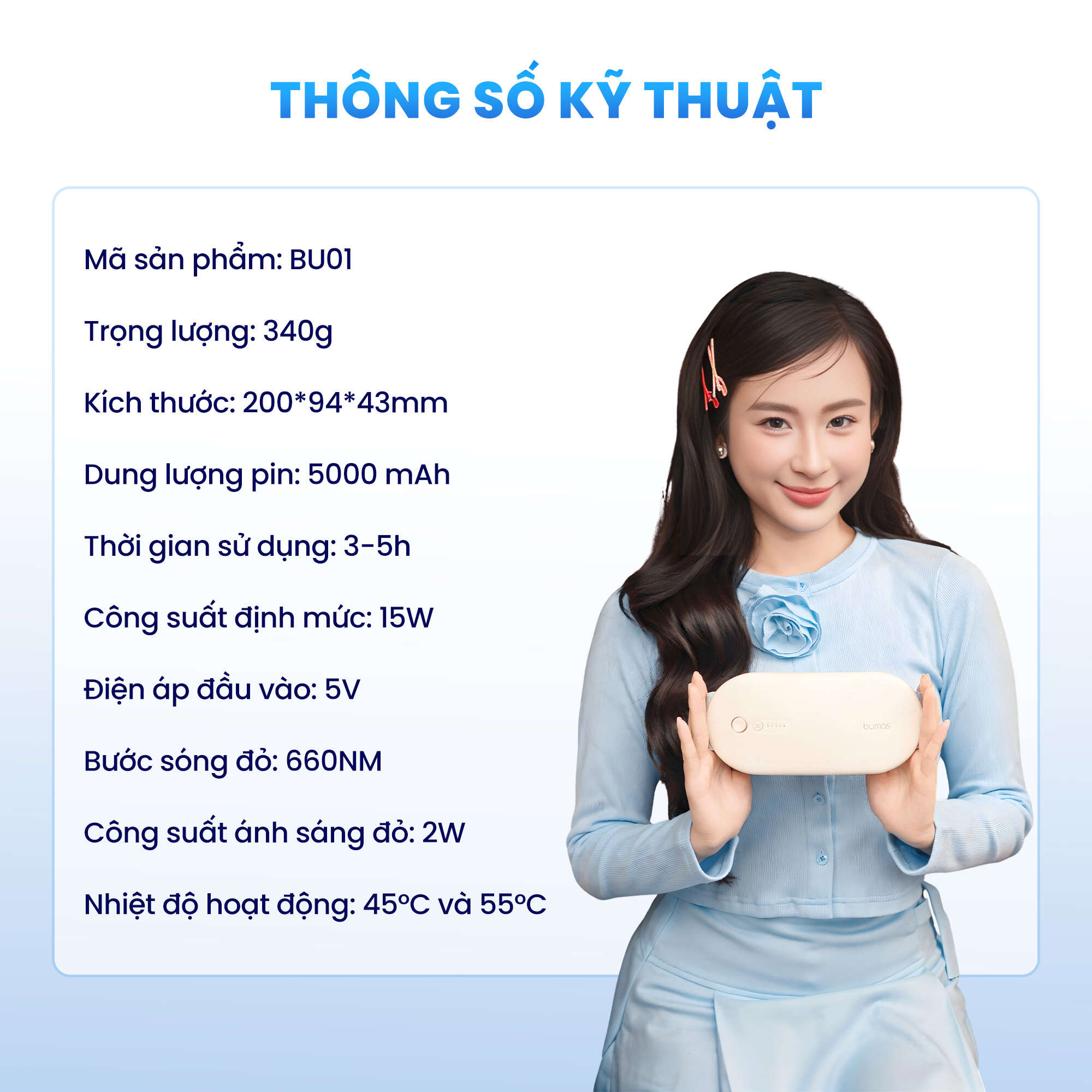 Đai massage bụng BU01 của BUMAS không chỉ làm ấm bụng còn các khả năng tác động sâu tử cung giúp đẩy nhanh giảm đau bụng kinh hơn, công nghệ kiểm soát nhiệt an toàn tuyệt đối với nhiều chế độ hơn cùng 6 điểm rung massage tạo cảm giác dễ chịu)