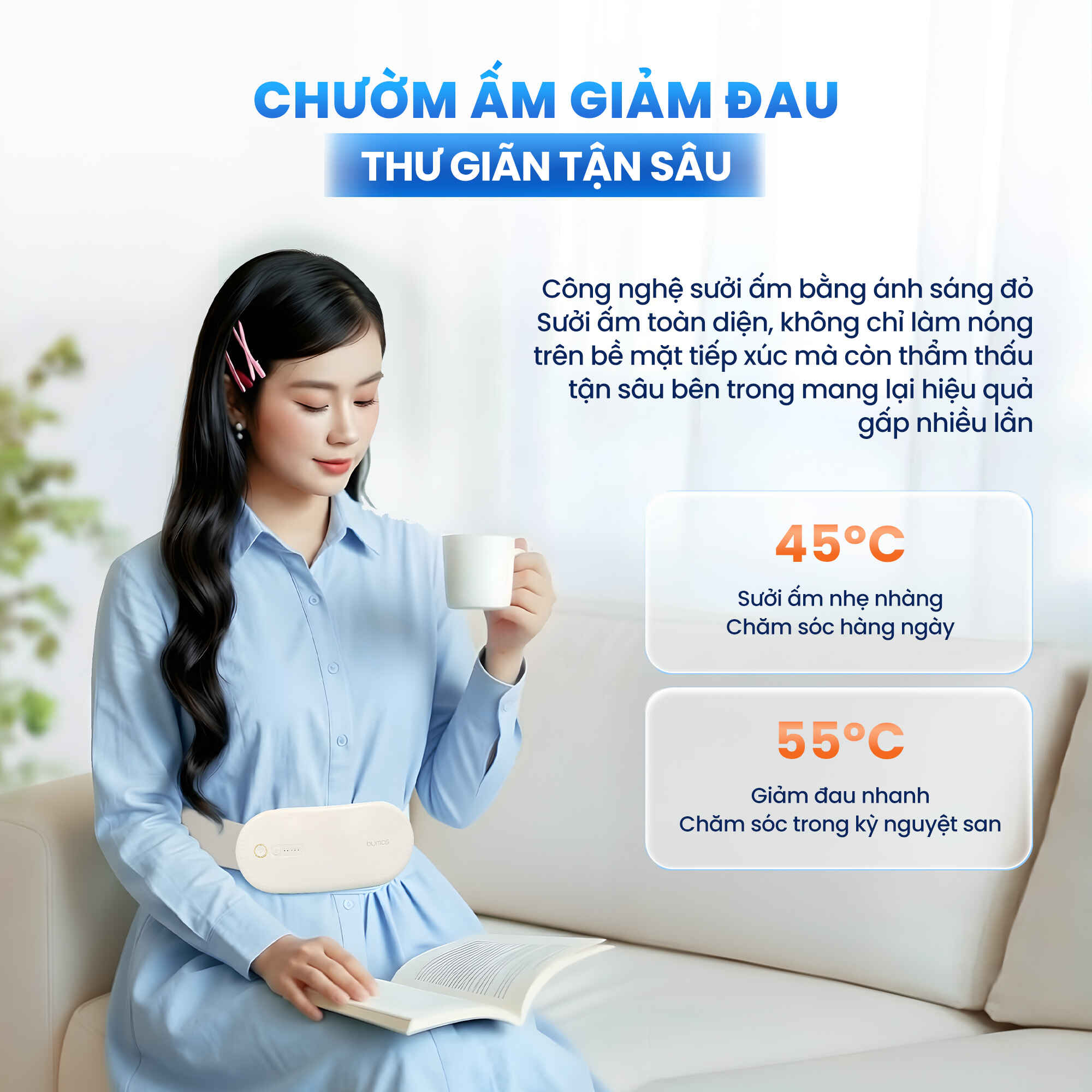 Đai gồm 2 mức nhiệt : 45 độ C (dùng massage hằng ngày) và 55 độ C (dùng chăm sóc kỳ kinh nguyệt)