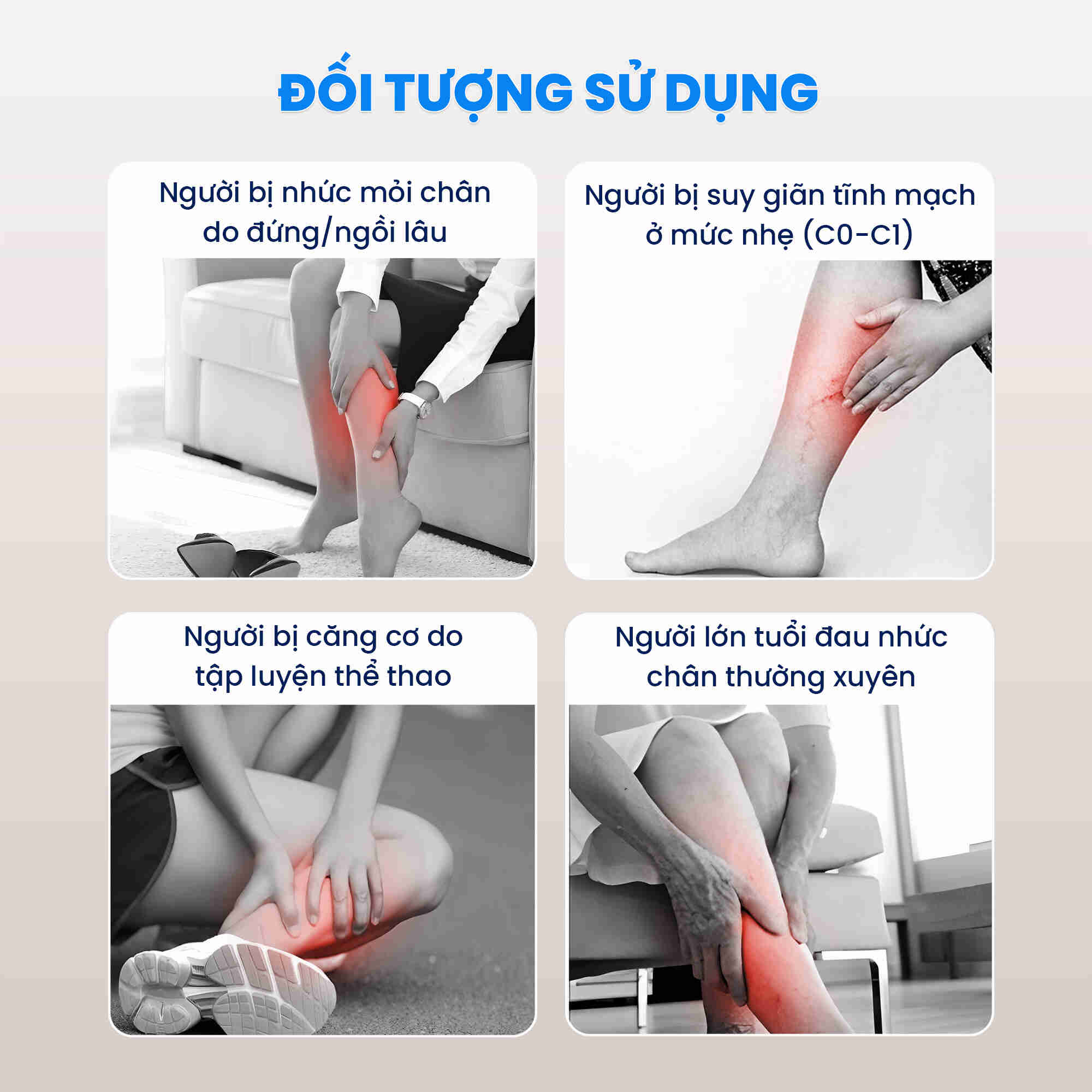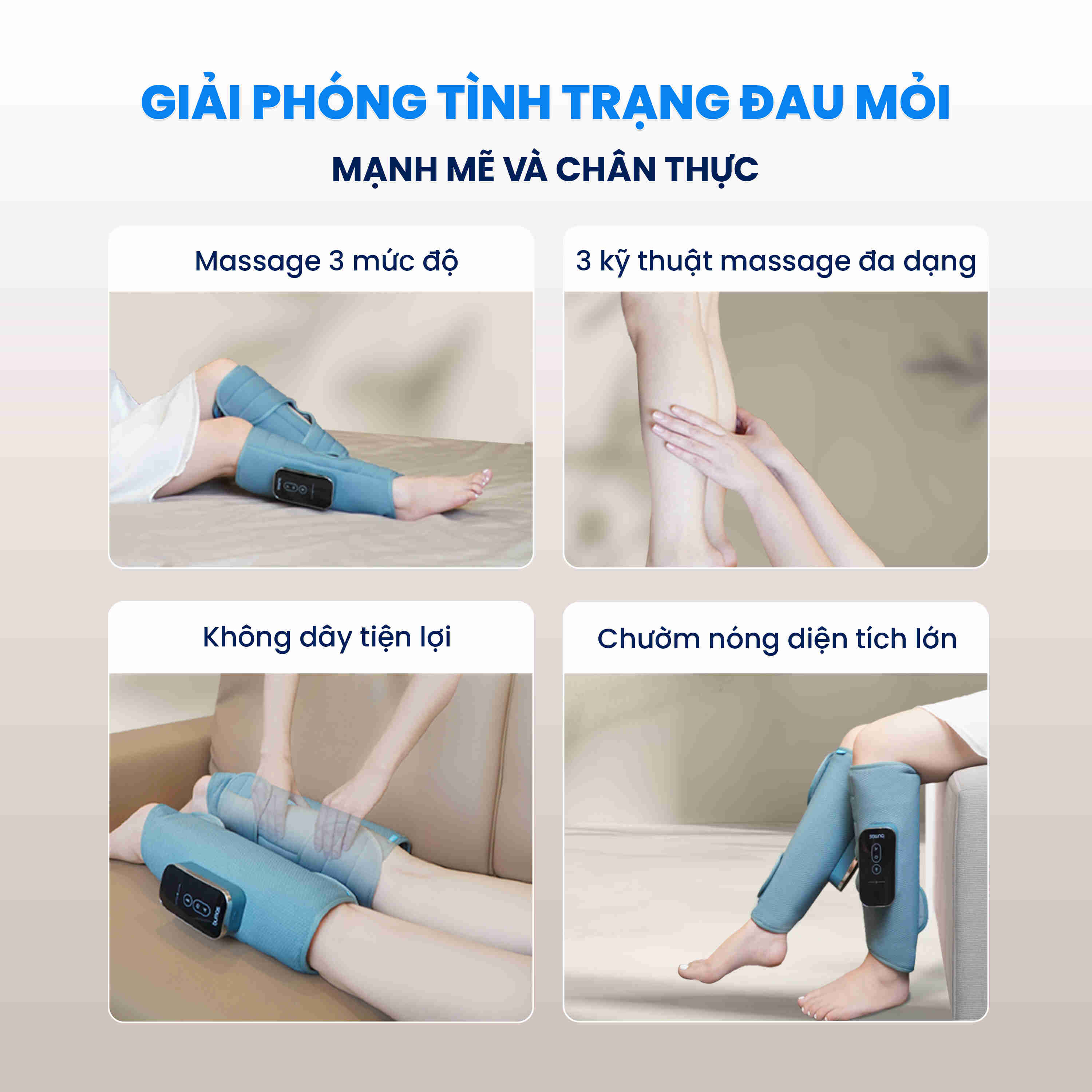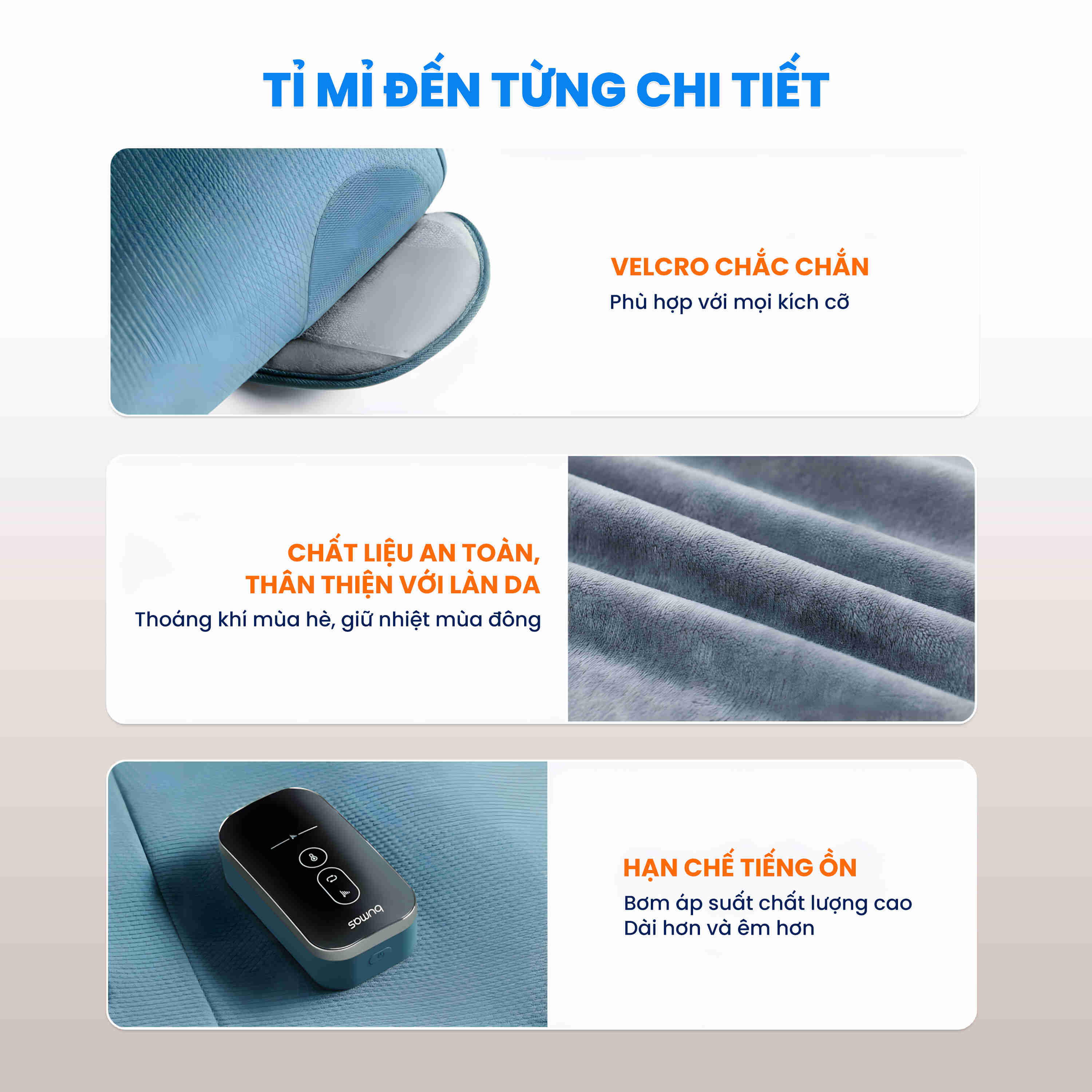 - THƯ GIÃN TỐI ĐA: Bộ phận massage được thiết kế ôm sát chân với phần vải bền, thông thoáng. Miếng dán chắc chắn dễ điều chỉnh và không bị bung trong quá trình bơm nén khí.