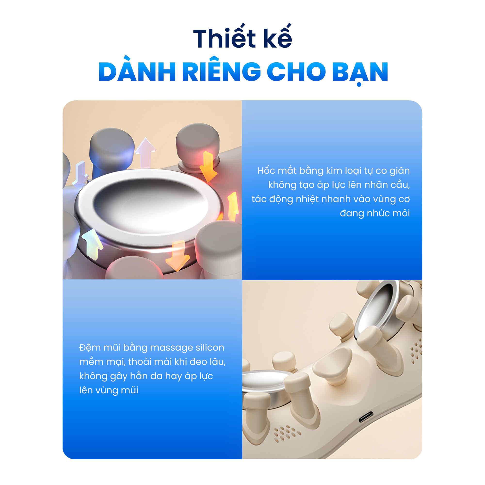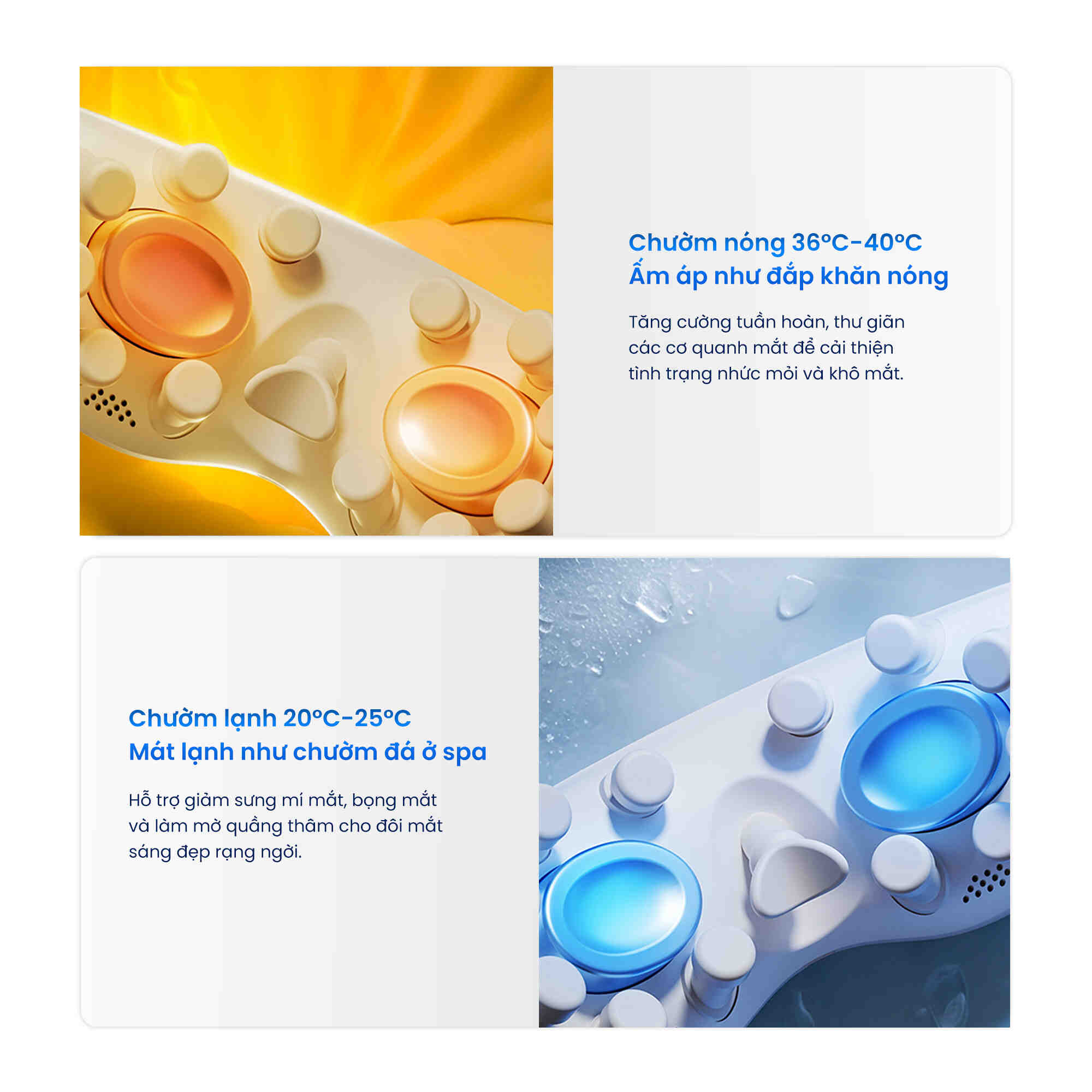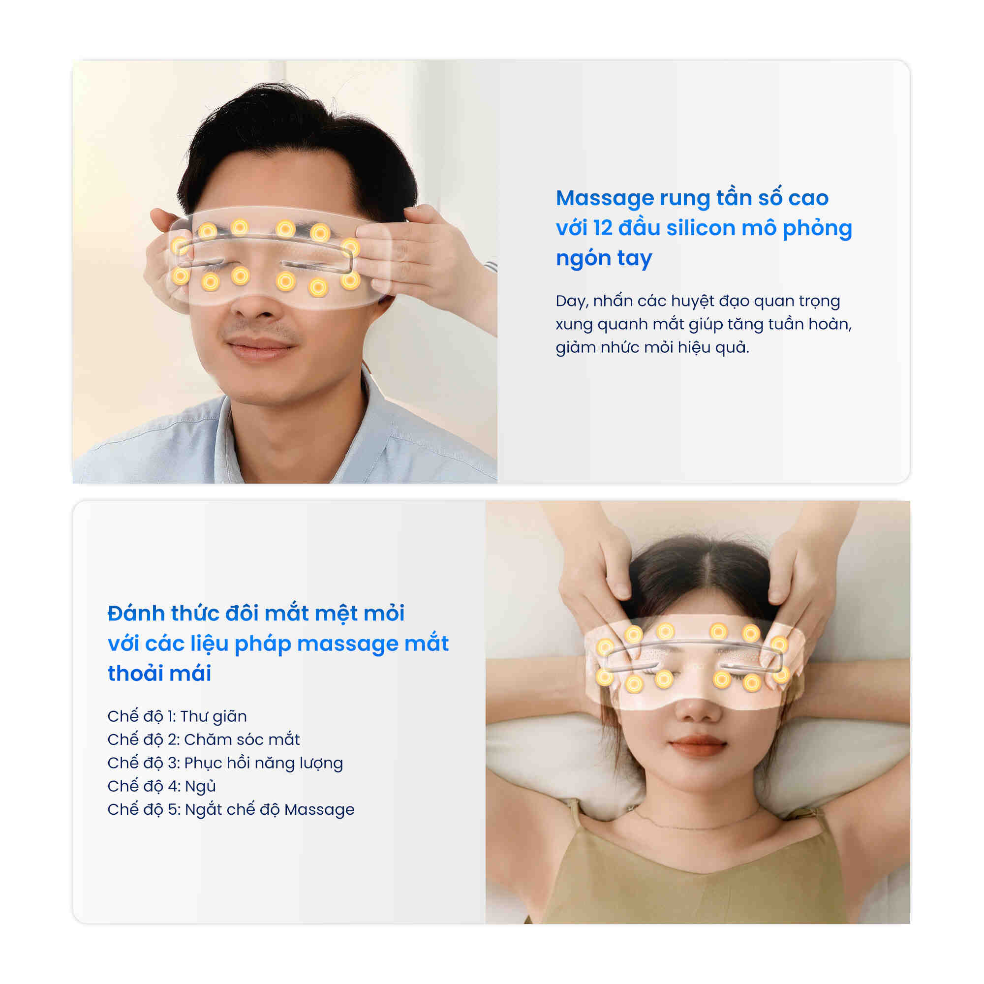 - Day nhấn chính xác các huyệt đạo xung quanh mắt cùng tấn số rung lên tới 15.000 vòng/phút kích thích lưu thông máu, cải thiện tình trạng khô, nhức mỏi, chăm sóc toàn diện cho đôi mắt