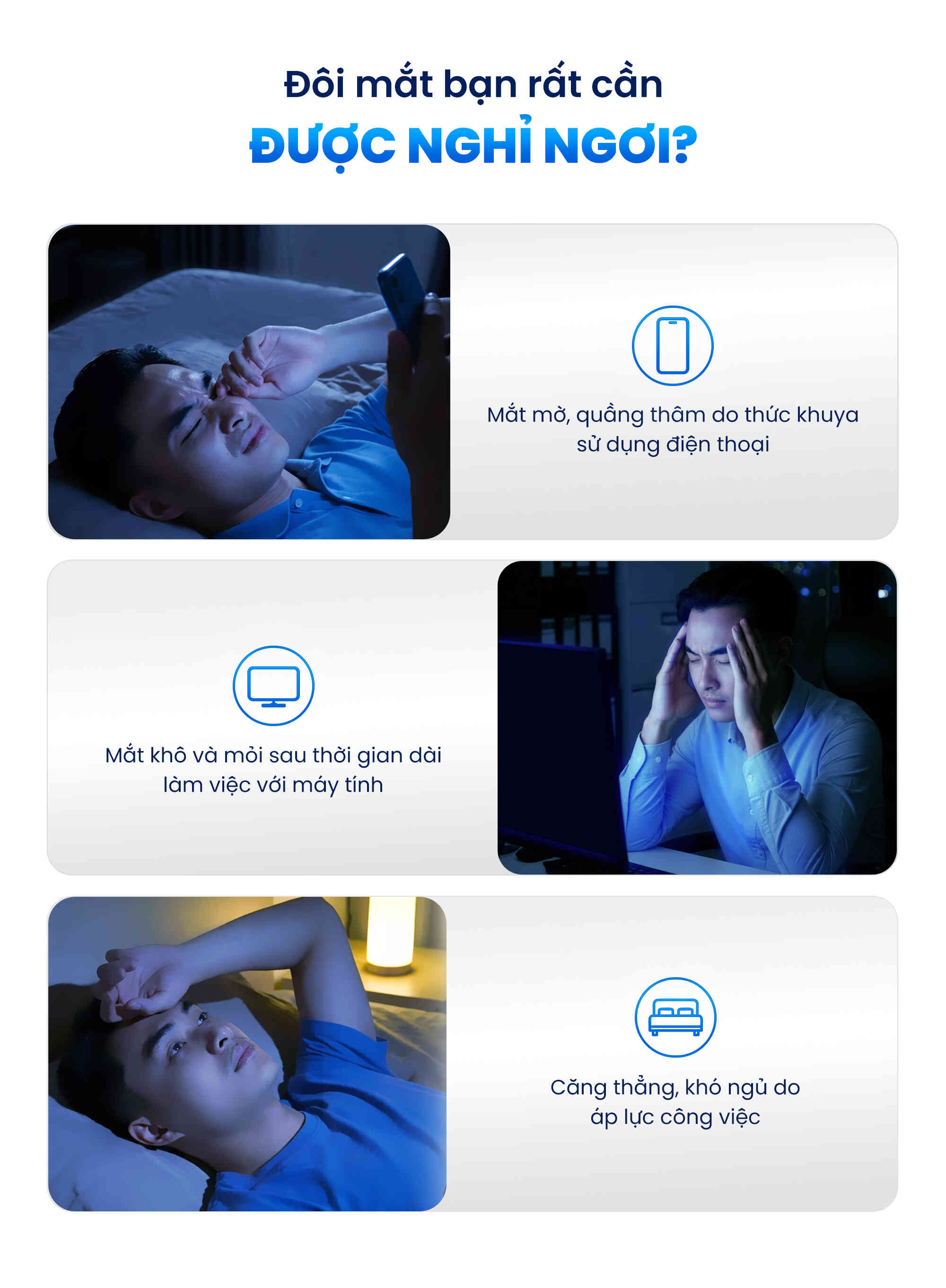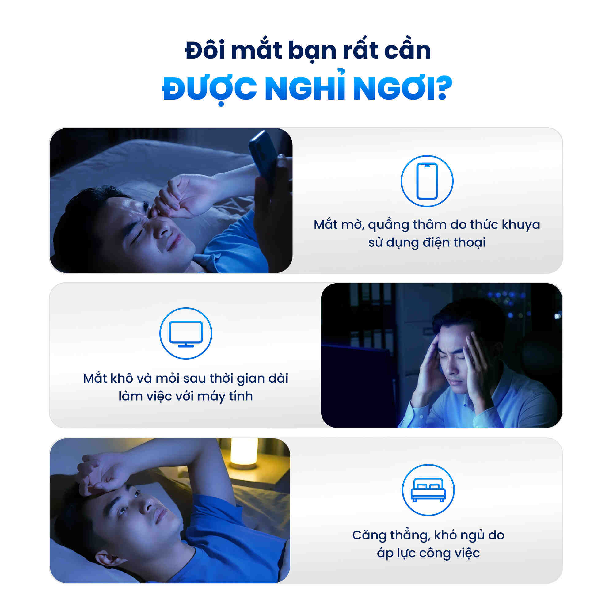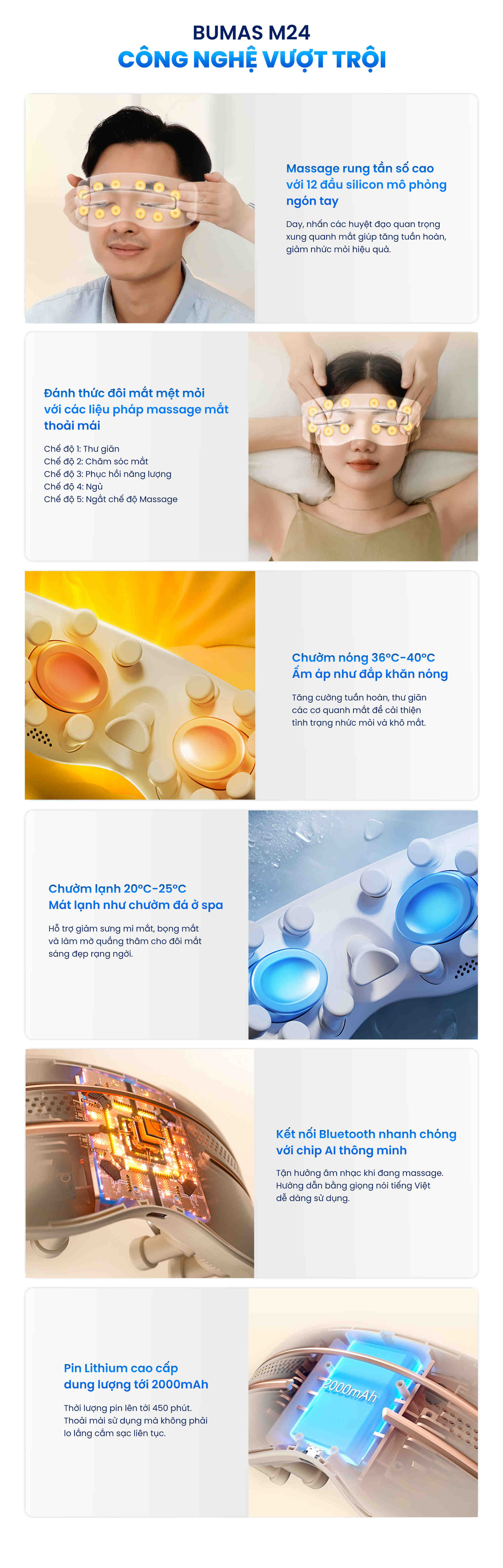 - Day nhấn chính xác các huyệt đạo xung quanh mắt cùng tấn số rung lên tới 15.000 vòng/phút kích thích lưu thông máu, cải thiện tình trạng khô, nhức mỏi, chăm sóc toàn diện cho đôi mắt