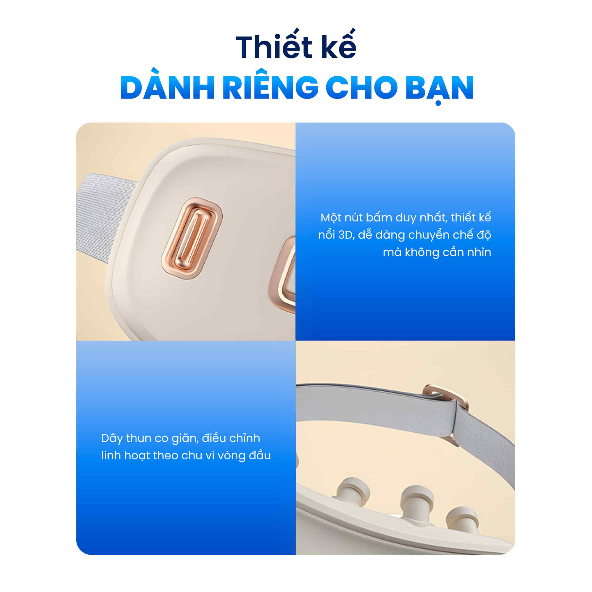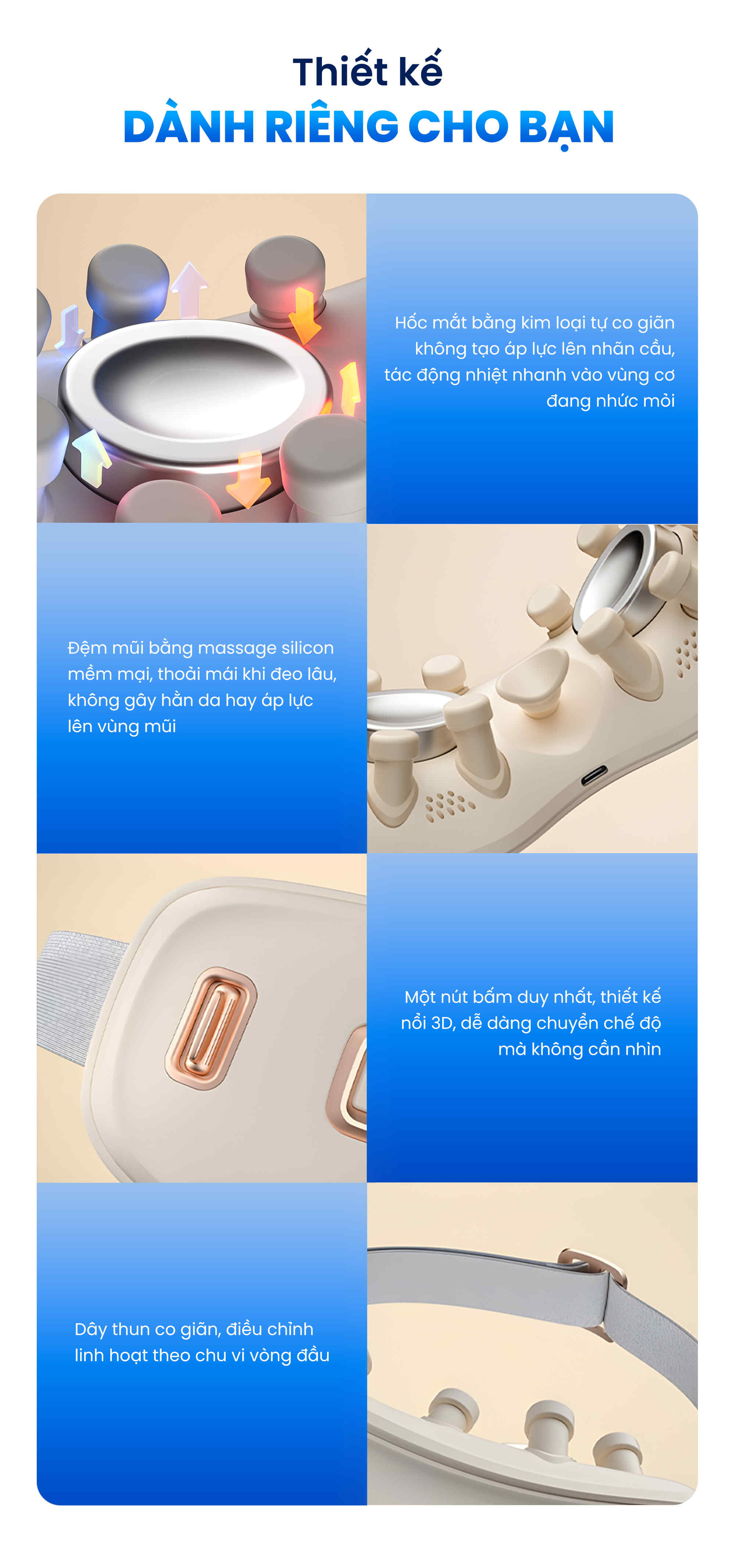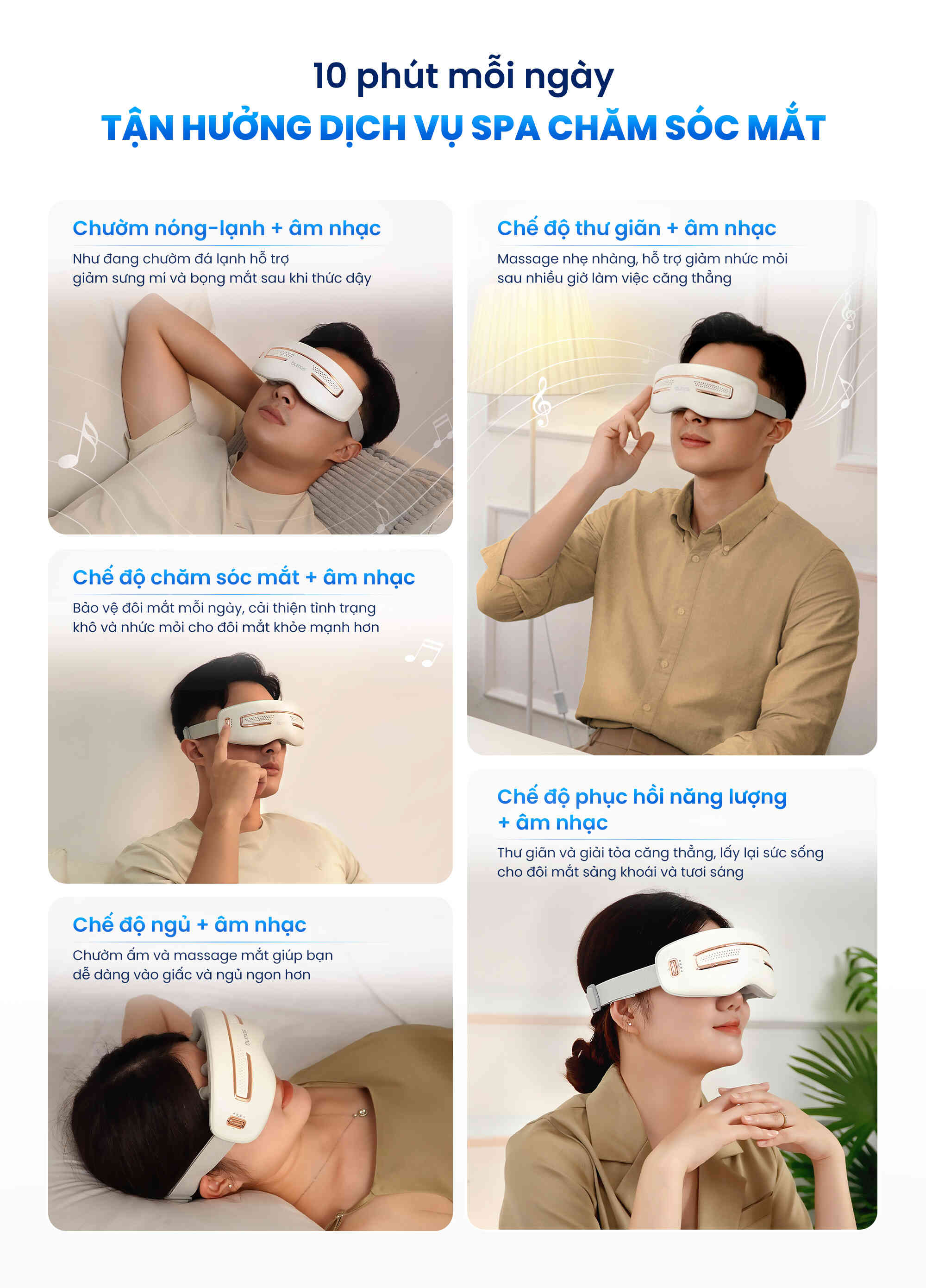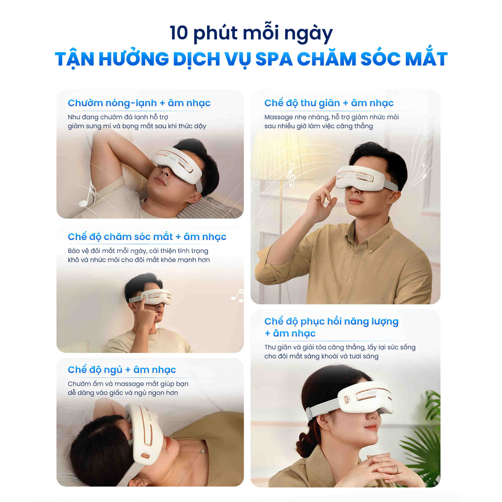 - 5 chế độ: Thư giãn, chăm sóc mắt, phục hồi năng lượng, ngủ, ngắt chế độ massage