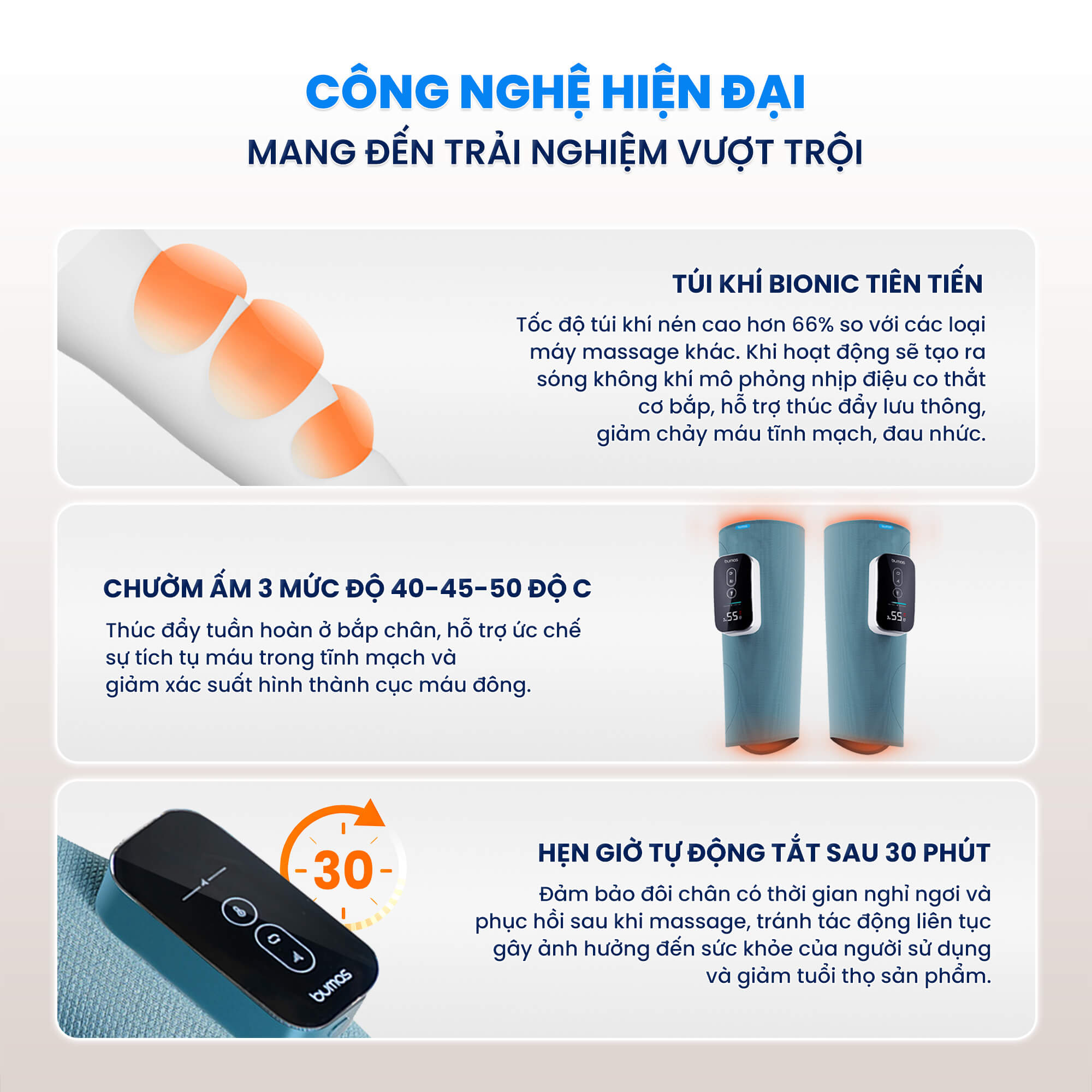 - CÔNG NGHỆ TÚI KHÍ BIONIC: Trải nghiệm sự massage mạnh mẽ với công nghệ túi khí Bionic, áp suất khí massage sâu và hiệu quả hơn bao giờ hết.